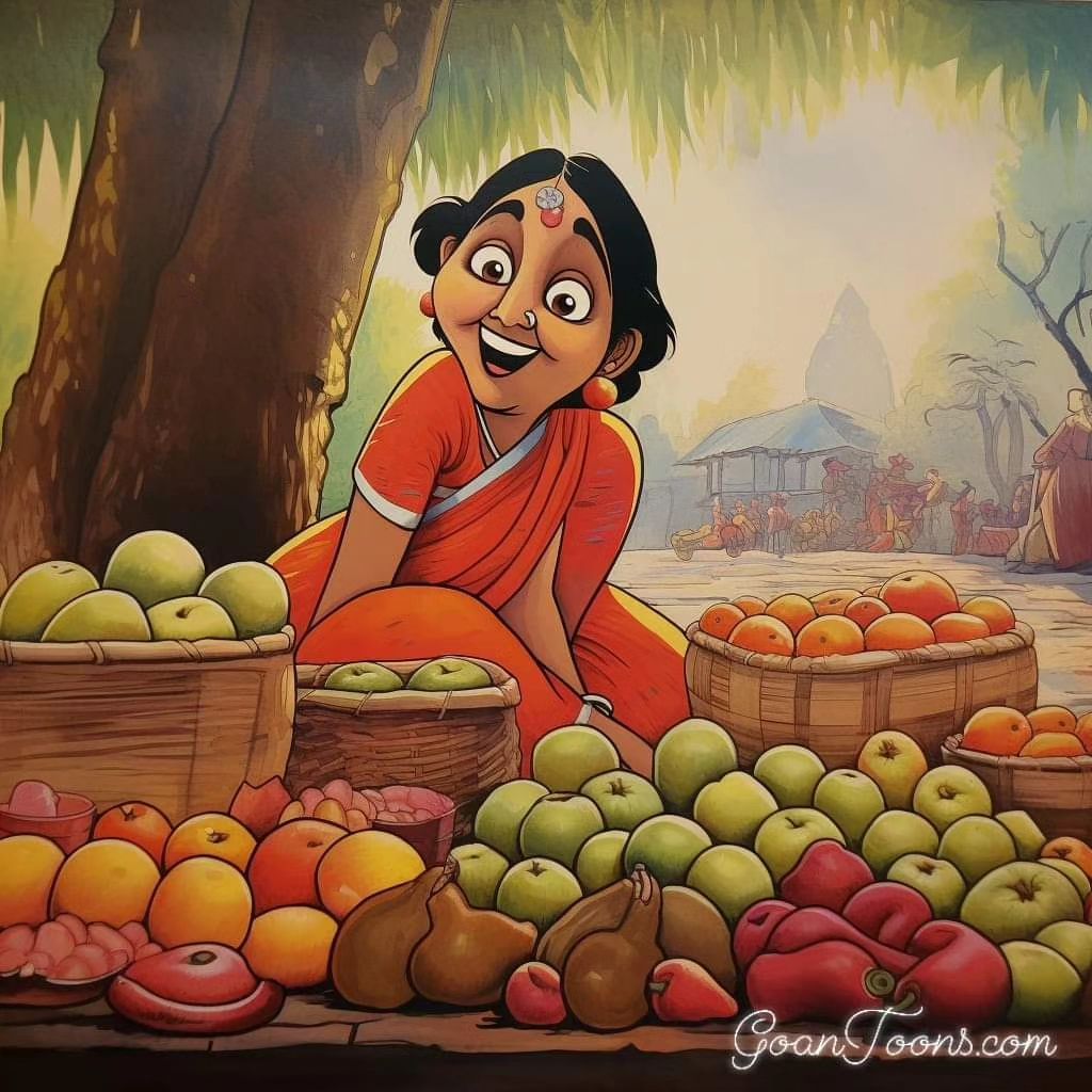 ??? Amidst the bustle of local markets, you will find the backbone of our famous Goan cuisines – the humble fruit vendors. This cartoon captures the spirit of one such vendor, a beacon of strength, resilience, and undying cheerfulness, despite her humble circumstances.