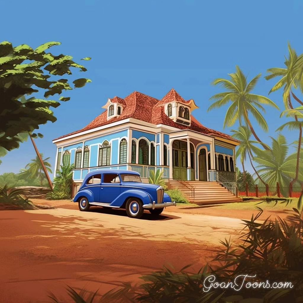 Our cartoon illustrates a captivating blue Portuguese Goan home – its large balcaões (balconies), towering roof, and ornate oyster-shell windows, all telling tales of a bygone era. These homes are much more than architectural marvels – they’re the heart of our vibrant communities, spaces of warmth, love, and age-old Goan hospitality.