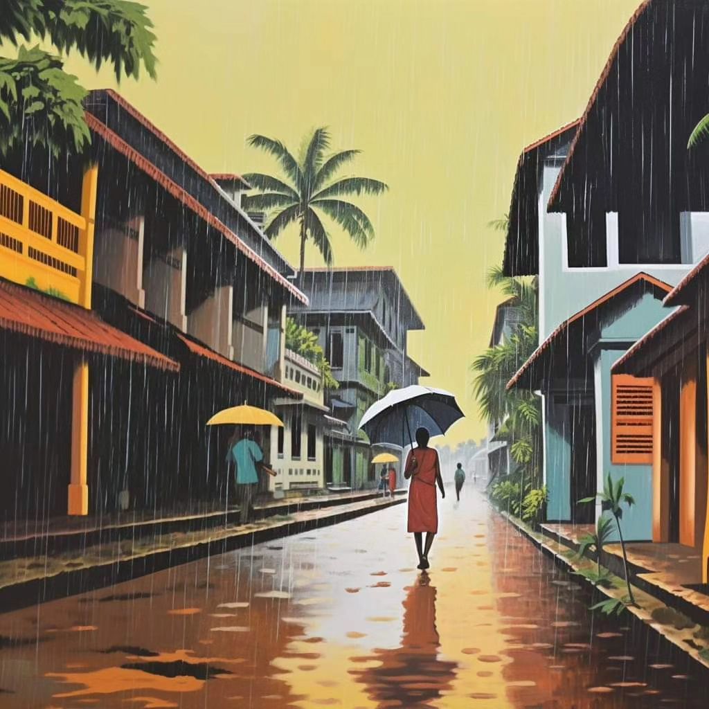 ?️☂️ A rainy day in the charming neighbourhood of Fontainhas, Goa’s colourful ode to its Portuguese past! This cartoon captures a typical monsoon scene – a Goan lady strolling under an umbrella along the vibrant streets of old Fontainhas. The cascading rain and the vibrant houses, all come together to paint a vivid and nostalgic picture of Goa.
